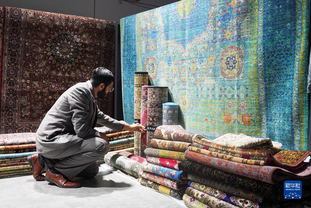 11月6日,在第六屆進博會食品及農展品展區,哈比在整理攤位內的手工地毯。