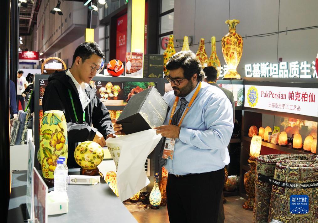 11月6日,在第六屆進博會食品及農展品展區,李明(右)為消費者包裝駱駝皮燈。