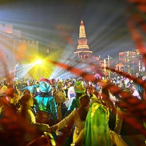 游客和演員在約特干故城一起跳舞(11月7日攝)。