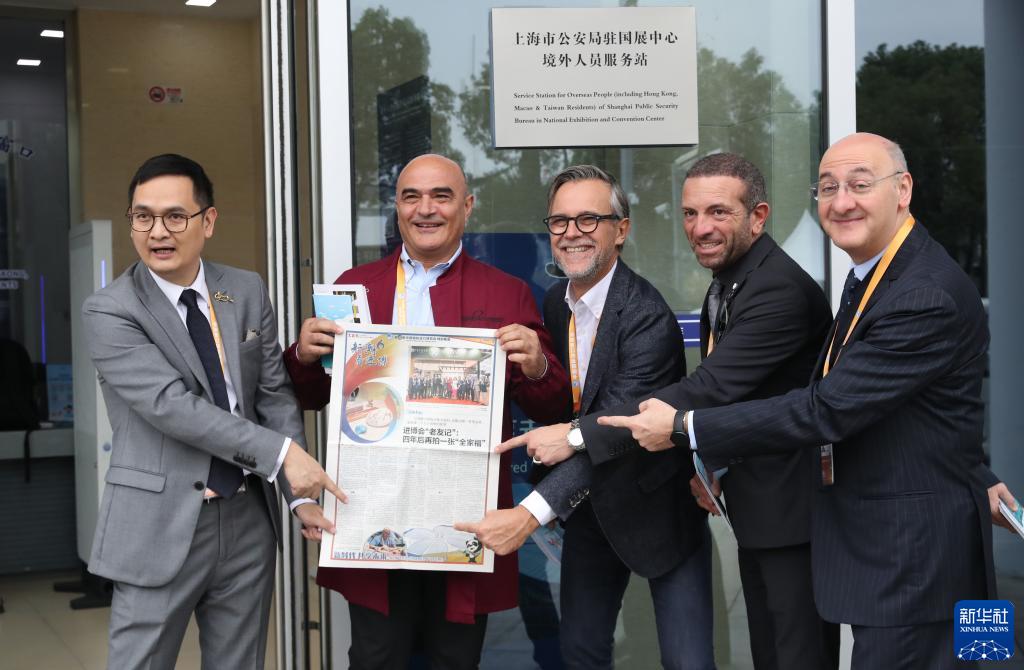 11月9日,在上海市公安局駐國展中心境外人員服務站,組團辦理簽證的意大利參展商手持有他們報道的本地報紙合影。
