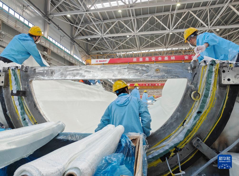 11月8日,在三一(塔城)風電設備有限公司,工人在車間加工風機葉片。