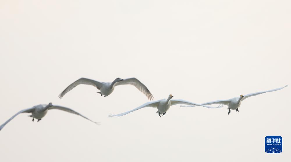 11月9日,大天鵝在三門峽市天鵝湖國家城市濕地公園上空飛翔。