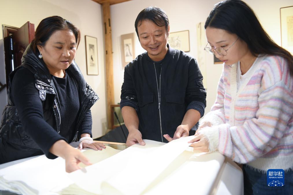 11月9日,在開化紙傳統技藝工坊,黃宏?。ㄖ校┖推拮淤圎惙迹ㄗ螅┫騺碓L者展示各類紙品。