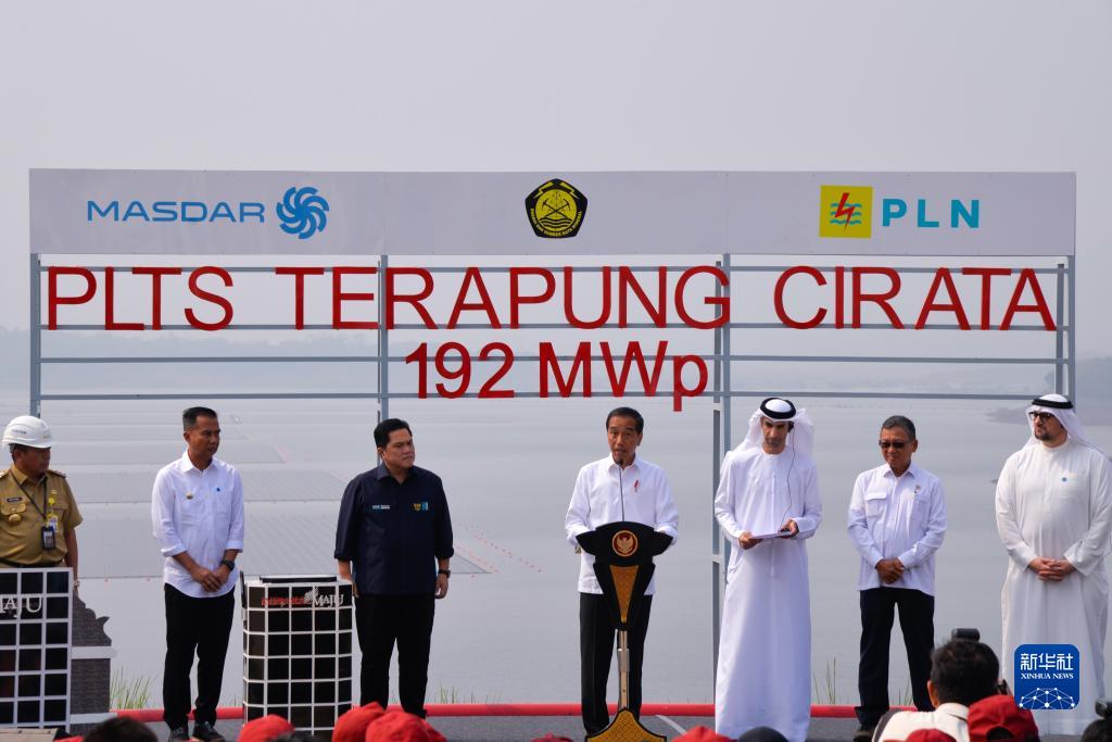 11月9日,印度尼西亞總統佐科(中)在西爪哇省芝拉塔水庫旁出席并網發電儀式。