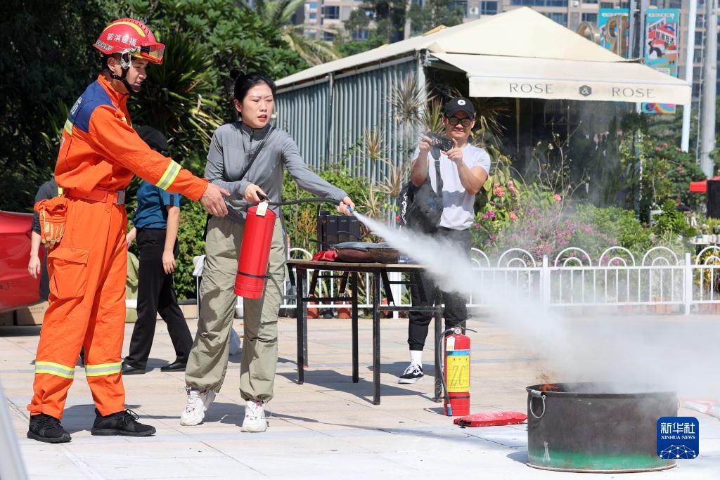 11月9日,在福建省廈門市湖里區,市民在消防員的指導下體驗使用滅火器。