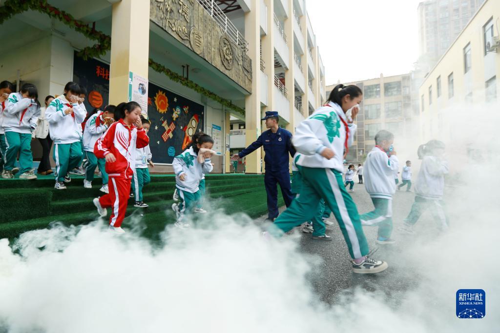 11月9日,在貴州省都勻市第四小學,消防救援人員引導學生進行應急逃生演練。