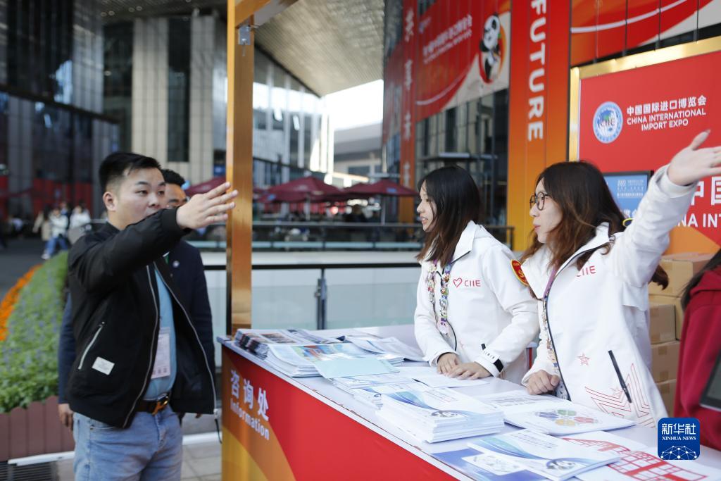 11月7日,在國家會展中心(上海),志愿者為參觀者指路。