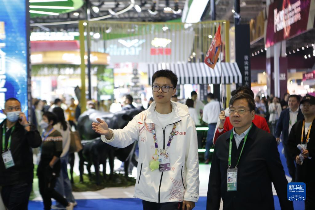 11月7日,在第六屆進博會上,上海理工大學志愿者鄭子鋒(左)在引導交易團參觀。