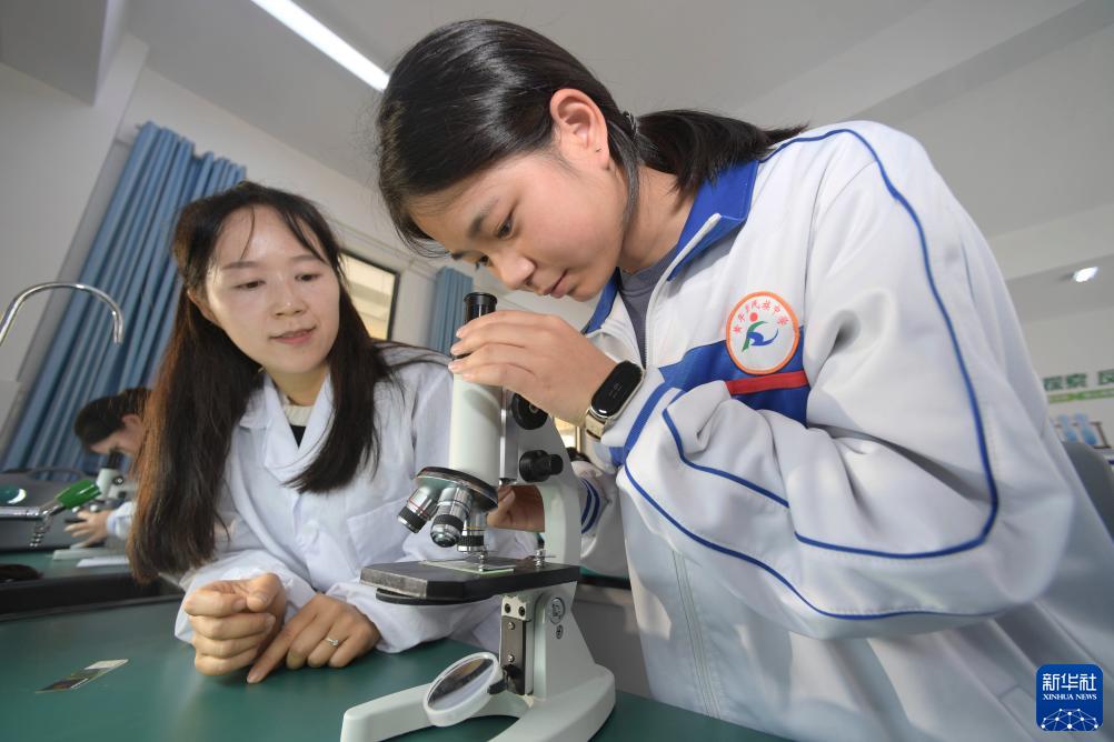 11月9日,在黃平民族中學實驗室,一名教師(左)帶領學生上實操課。