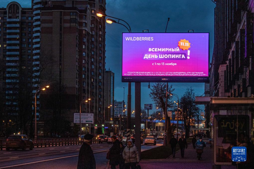 11月8日,在俄羅斯首都莫斯科,行人在播放電商平臺“雙十一”促銷廣告的顯示屏前走過。