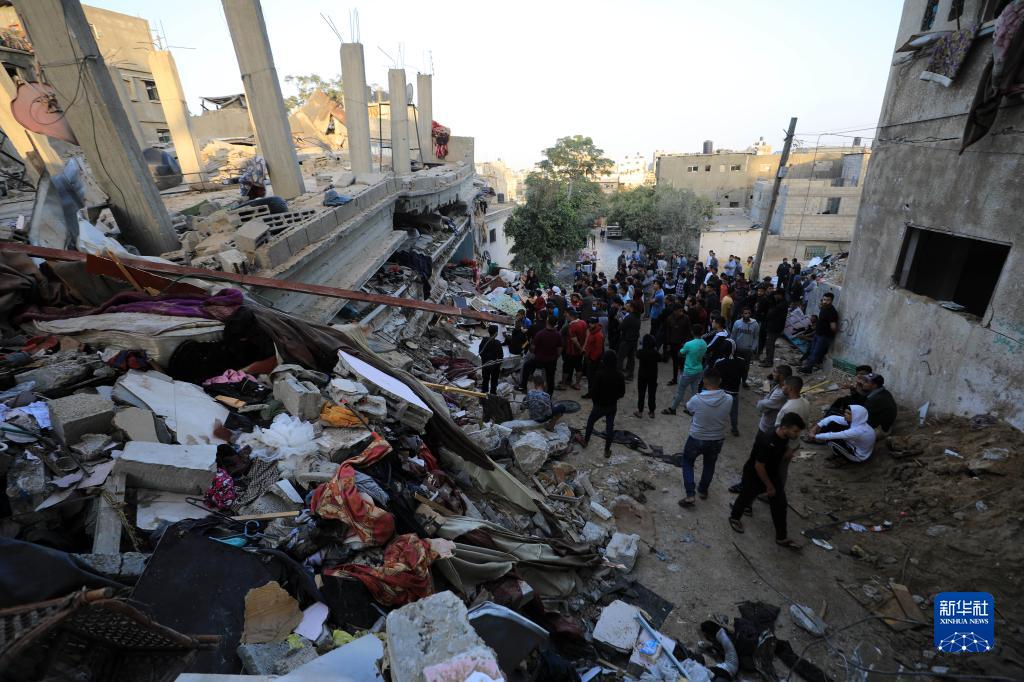 11月9日,在加沙地帶南部城市汗尤尼斯,人們在遭以色列襲擊后的建筑廢墟中實施救援。