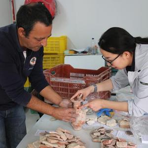 11月9日,在突尼斯本阿魯斯,中國和突尼斯考古人員整理從遺址中發掘的陶器。