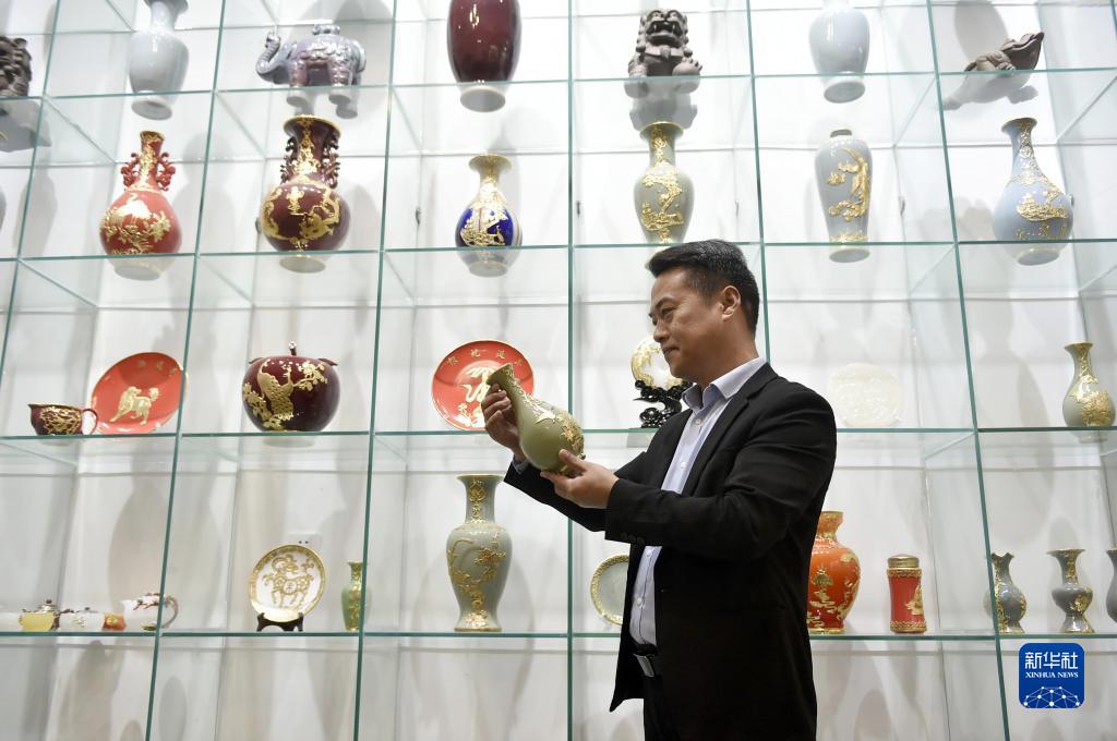 11月9日,李冰在三郎廟村的金鑲玉制作技藝研學基地檢查展架上的金鑲玉作品。
