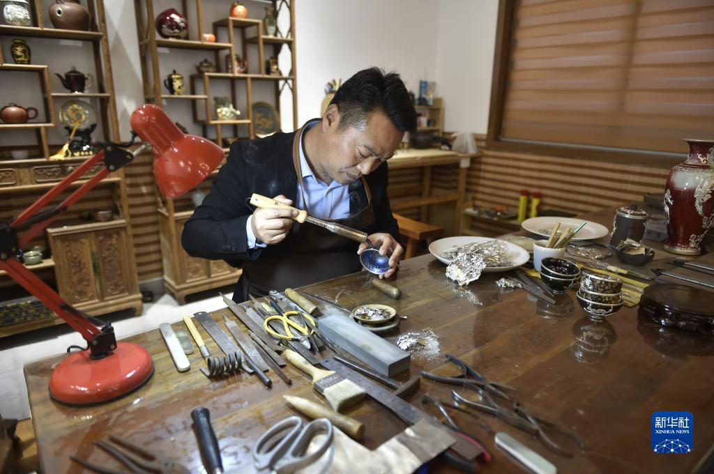 河南省郟縣金鑲玉制作技藝是國家級非物質文化遺產代表性項目,歷史悠久,獨具文化內涵和藝術價值。據介紹,金鑲玉制作技藝原為對有瑕疵或破損的玉石、茶具等器物,用銅、錫等金屬絲片進行掩飾、修補的鑲嵌工藝,后來逐步發展成為在陶瓷、紫砂等器物表面鑲嵌不同金屬(或合金)圖紋裝飾的獨特工藝。