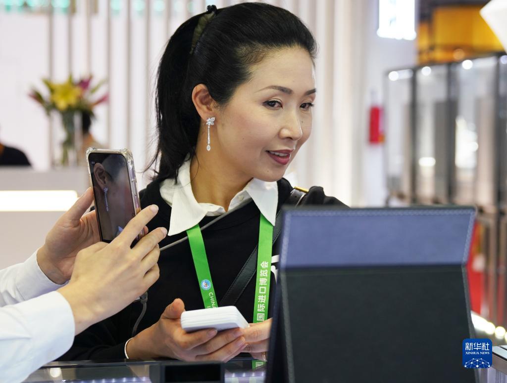 11月9日,在第六屆進博會消費品展區EJI(雅寶珠寶國際有限公司)展臺,參觀者試戴鉆石耳飾。