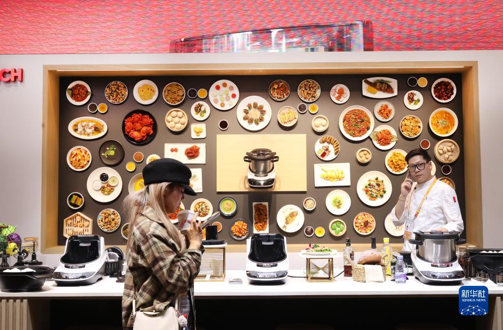 11月10日,在第六屆進博會上,參觀者從一家廚房電器展臺的菜肴裝飾墻前走過。
