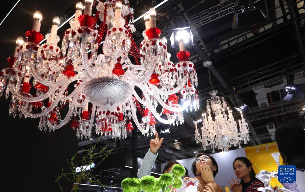 11月10日,在第六屆進博會上,參觀者在捷克水晶燈下駐足觀看。