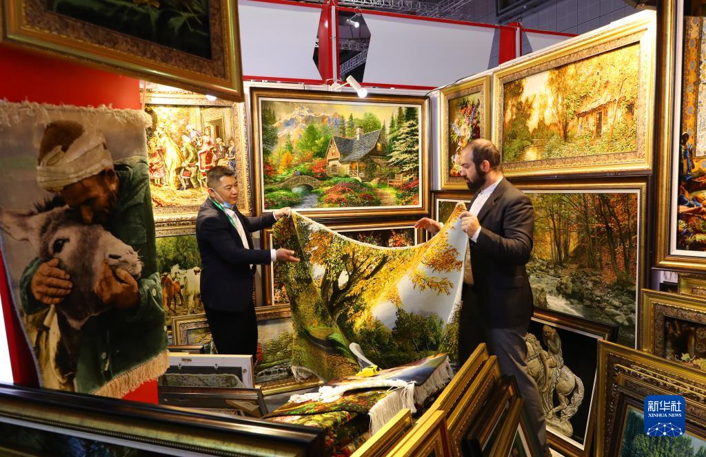 11月10日,在第六屆進博會上,一名參觀者在一家伊朗手工掛毯展位上查看一款風景畫掛毯。