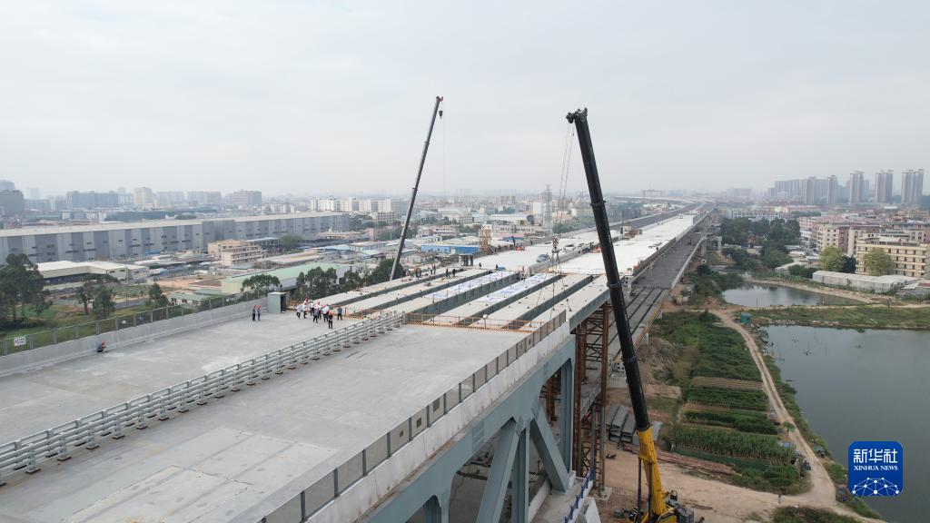 11月10日,莞番高速公路最后一段鋼箱梁吊裝完成(無人機照片)。