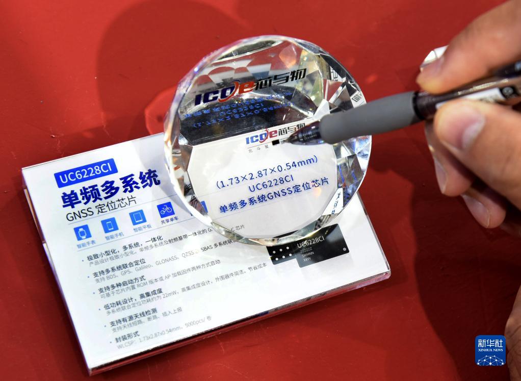 11月10日,一名參展商介紹基于北斗技術的國產微型定位芯片。
