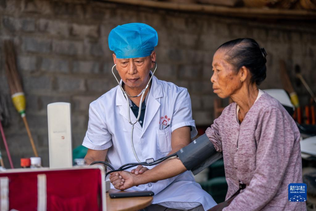 在瑞麗市畹町鎮混板村委會弄片村民小組,沈坤在家訪時為村民測量血壓(10月28日攝)。