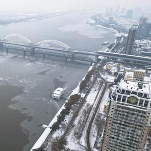 11月10日拍攝的開始結冰的松花江哈爾濱段(無人機照片)。