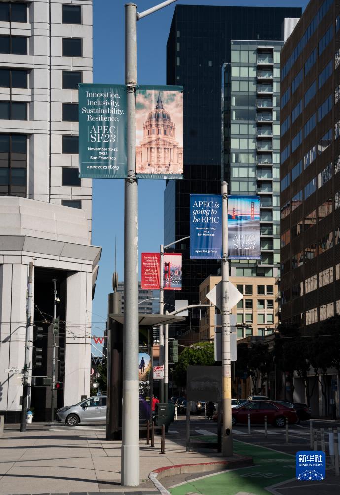 這是11月7日在美國舊金山拍攝的亞太經合組織會議場地外的宣傳海報。