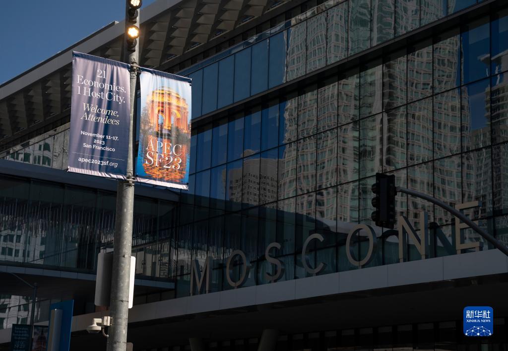 這是11月7日在美國舊金山拍攝的亞太經合組織會議場地外的宣傳海報。