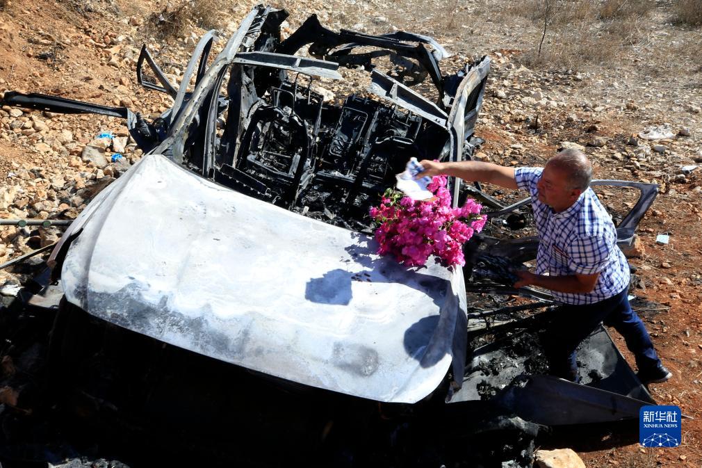 11月6日,在黎巴嫩南部艾納塔,遇難者的親屬將一束花放在被以色列無人機炸毀的車輛殘骸上。