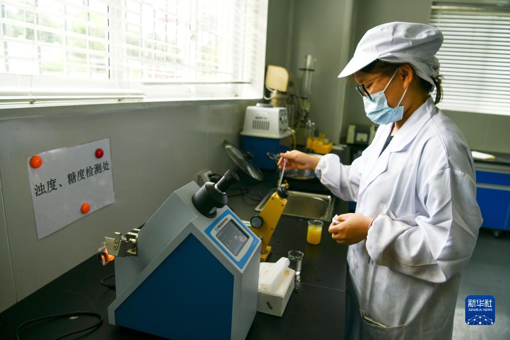 貴州省龍里縣高新技術產業園區一家刺梨加工企業的員工檢查刺梨的濁度和糖度(2021年8月19日攝)。