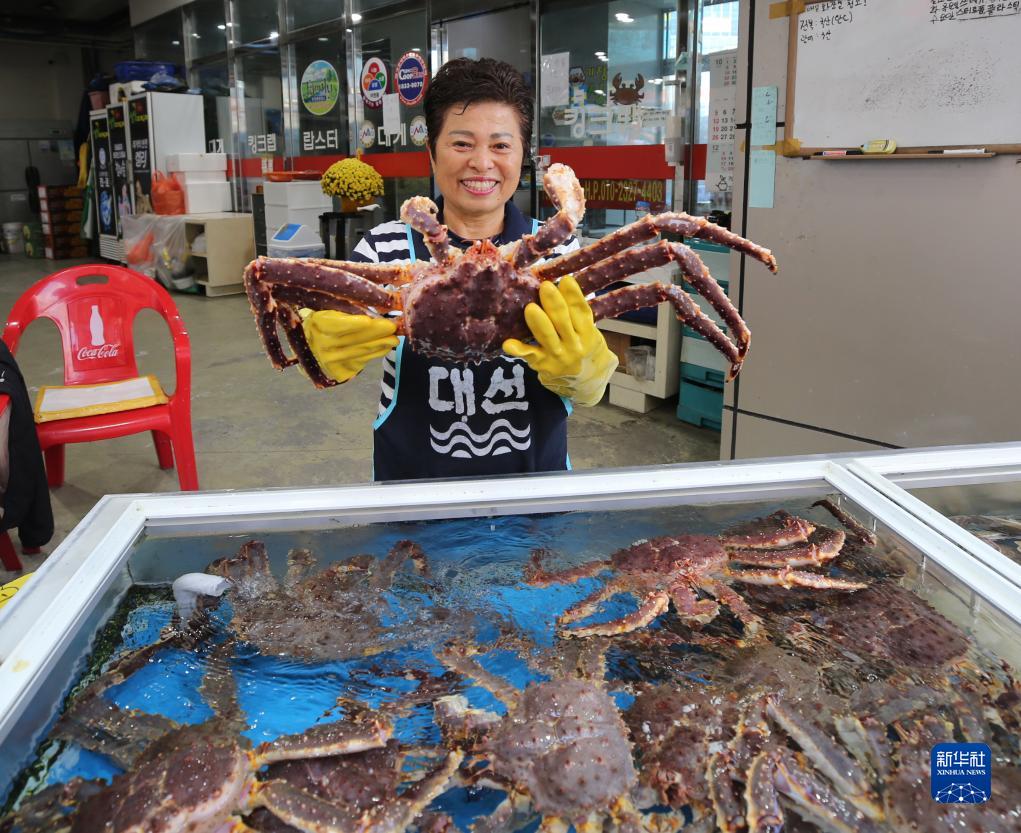 11月10日,在韓國釜山機張郡附近,一名水產商人展示售賣的帝王蟹。