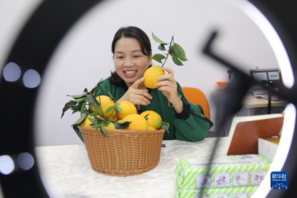 11月11日,在湖南省永州市道縣道滋味有限責任公司,主播在網絡平臺上推廣當地臍橙。