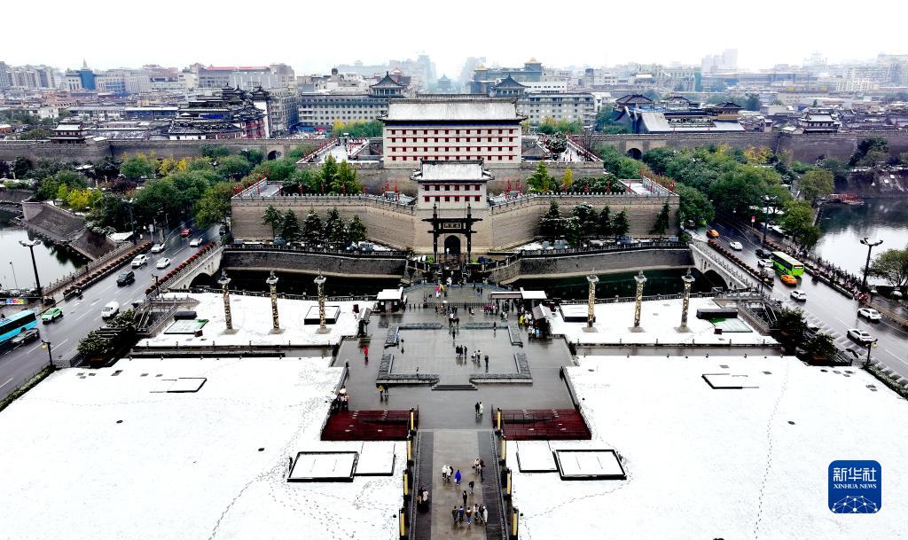 當日,陜西省西安市迎來立冬以來首場降雪,白雪掩映下的古都古樸寧靜。