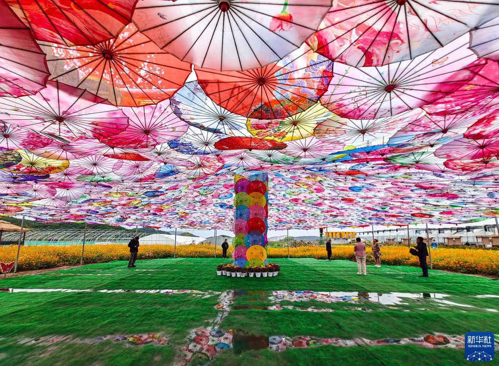 11月11日,游客在寧波市寧??h力洋鎮海頭村的傘棚下游玩賞花。