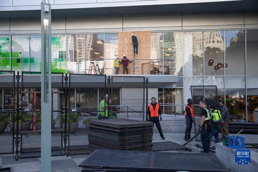 11月10日,工作人員在美國舊金山亞太經合組織會議場地外安裝金屬圍欄。