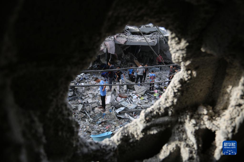11月11日,在加沙地帶南部城市拉法,人們查看遭以色列襲擊后的建筑。