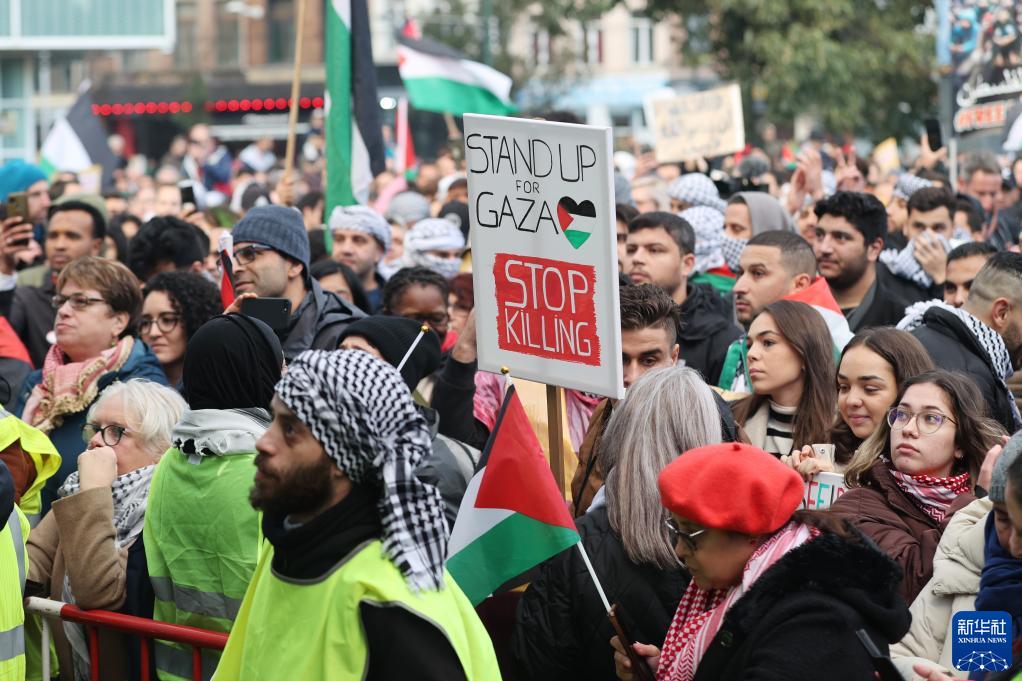 當日,眾多巴勒斯坦支持者在比利時布魯塞爾集會,呼吁盡快實現加沙?;?。