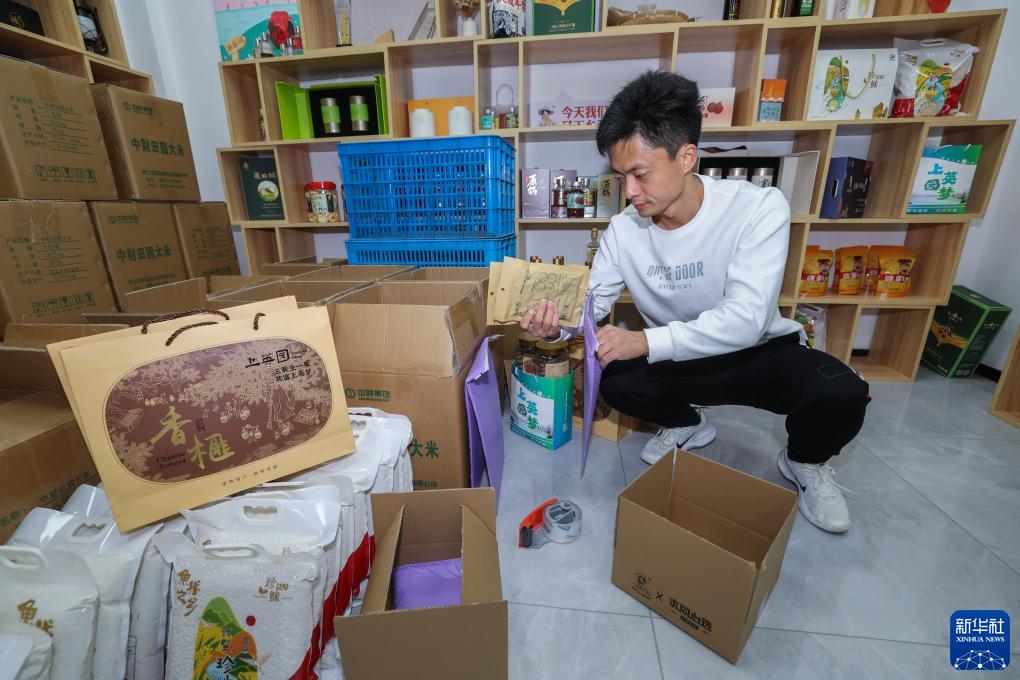 11月12日,浙江省諸暨市東白湖鎮上英村黨總支書記趙堅均在直播間打包香榧產品準備發貨。