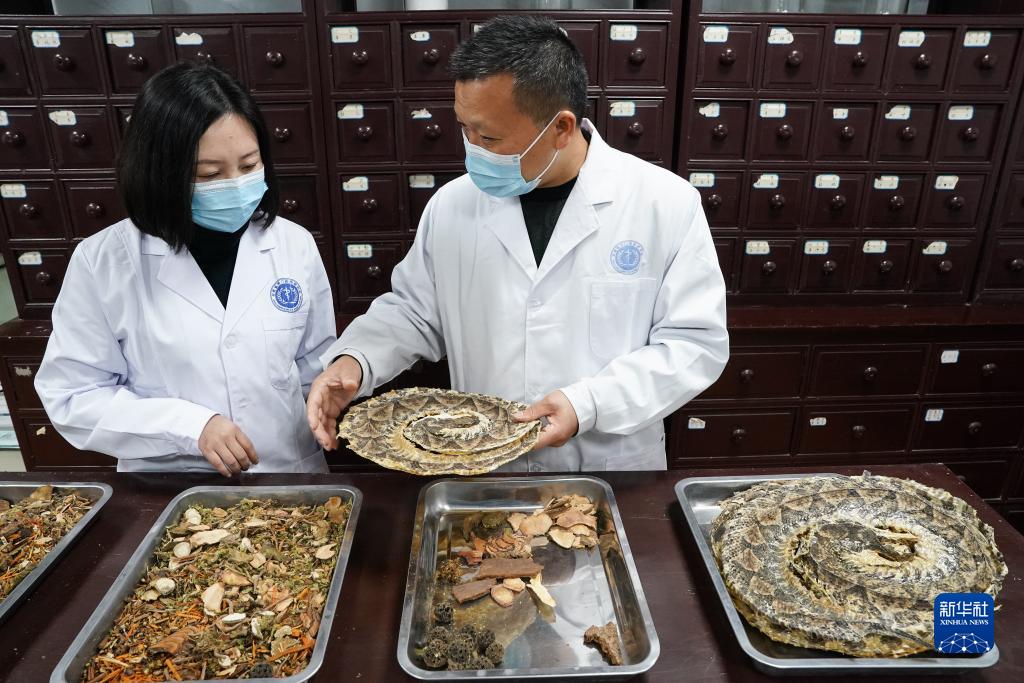11月8日,在安徽省祁門蛇傷研究所,研究所所長倪永松(右)與工作人員一起盤點蛇藥。