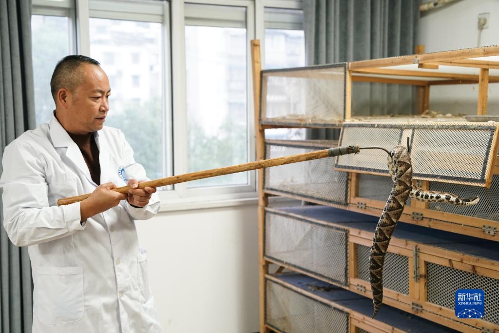 11月8日,在安徽省祁門蛇傷研究所,工作人員取出五步蛇用于研究。