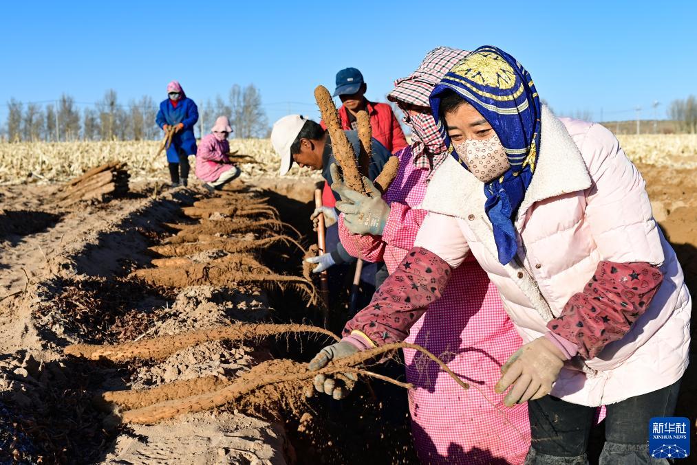 11月12日,在鄂托克前旗城川鎮章昂希里村的沙地農田,農民采收白玉山藥。