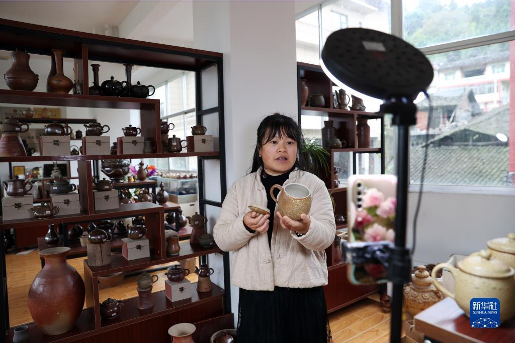 11月11日,在重慶市黔江區濯水鎮石雞坨土陶非遺工坊,工人直播銷售土陶產品。