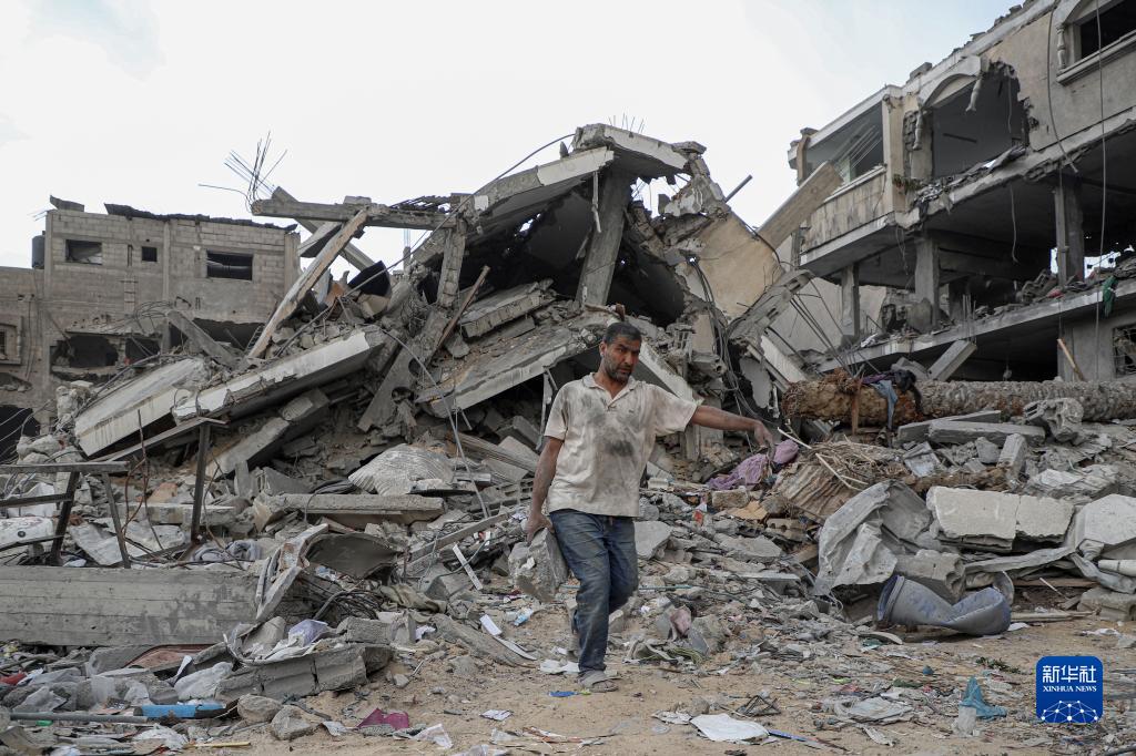 11月12日,一名男子在加沙地帶南部城市汗尤尼斯清理建筑廢墟。