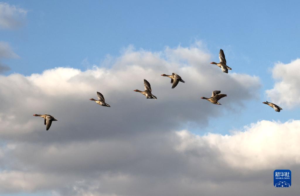 11月12日,在黃河三角洲國家級自然保護區,一群灰雁在飛翔。