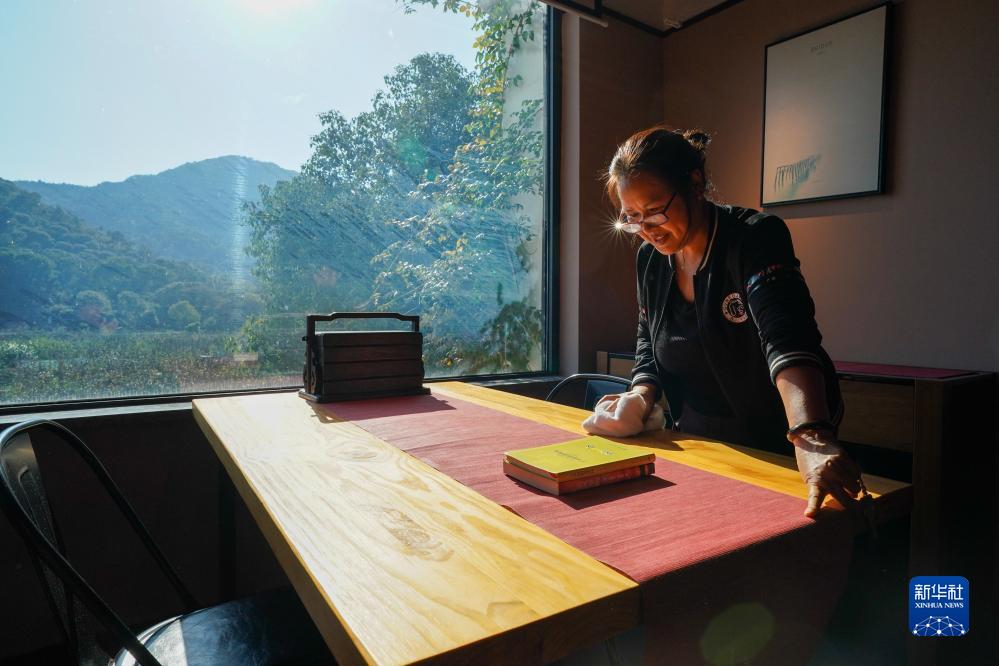 工作人員在樹山村的一家民宿內整理打掃(11月2日攝)。