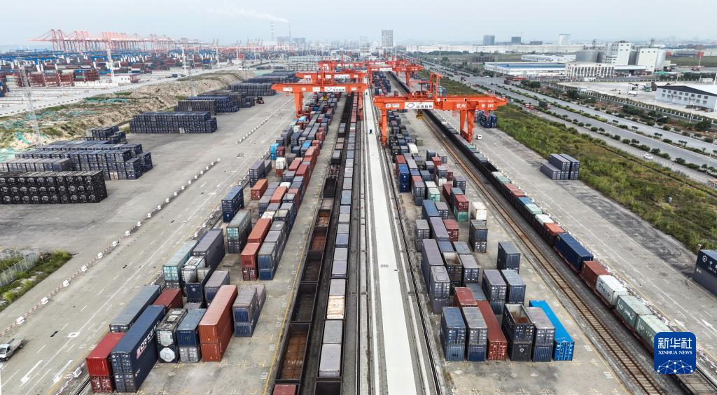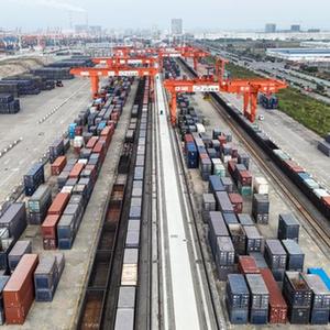 火車在欽州港碼頭裝運集裝箱(11月12日攝,無人機照片)。