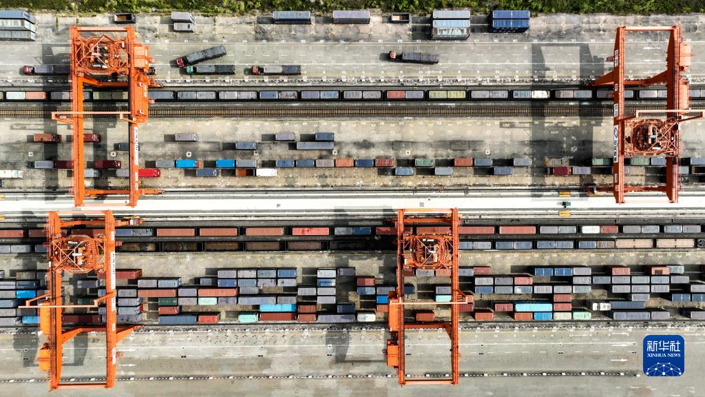 火車在欽州港碼頭裝運集裝箱(11月12日攝,無人機照片)。
