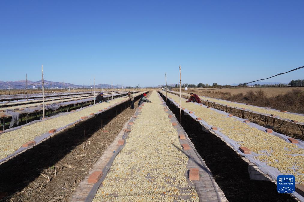 11月13日,秦皇島市昌黎縣團林鄉的扇貝養殖戶在晾曬收獲的扇貝柱。