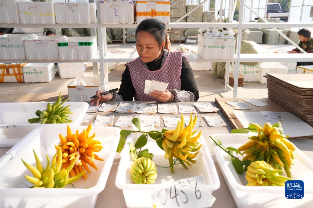 11月13日,在金華市婺城區羅店鎮金佛手果園共富工坊,工作人員在核對網絡銷售佛手的快遞單號。