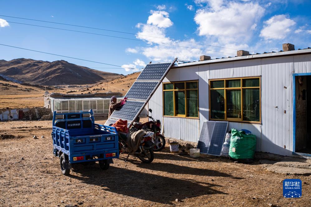 在當雄縣納木湖鄉達布村的冬季放牧點,云丹在擦拭太陽能板(11月10日攝)。